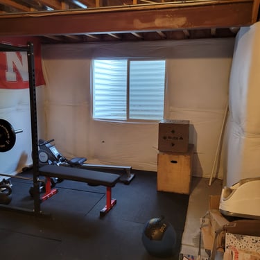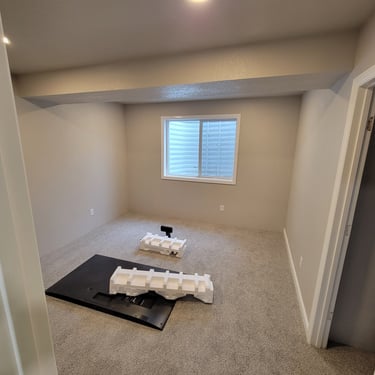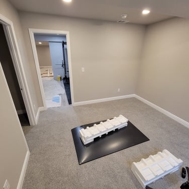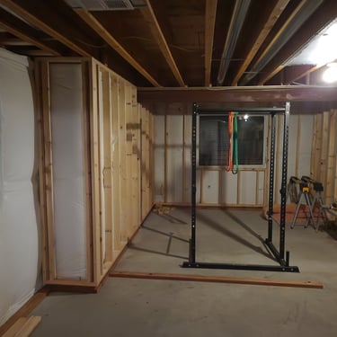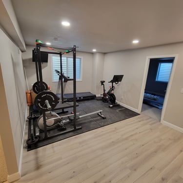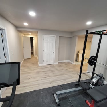 A 900 square foot basement with a new bedroom, bathroom, workout room and living room.